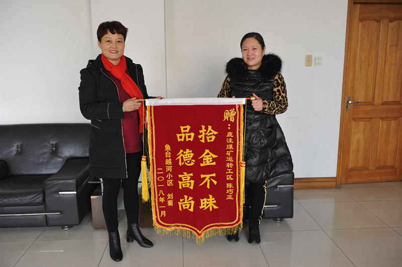 1月30日上午,鱼台县越河小区居民刘菊将一面印有"拾金不昧、品德高尚"的锦旗,专程来到鹿洼煤矿运转工区,赠给职工陈巧亚,对她拾金不昧的行为表示再次感谢。