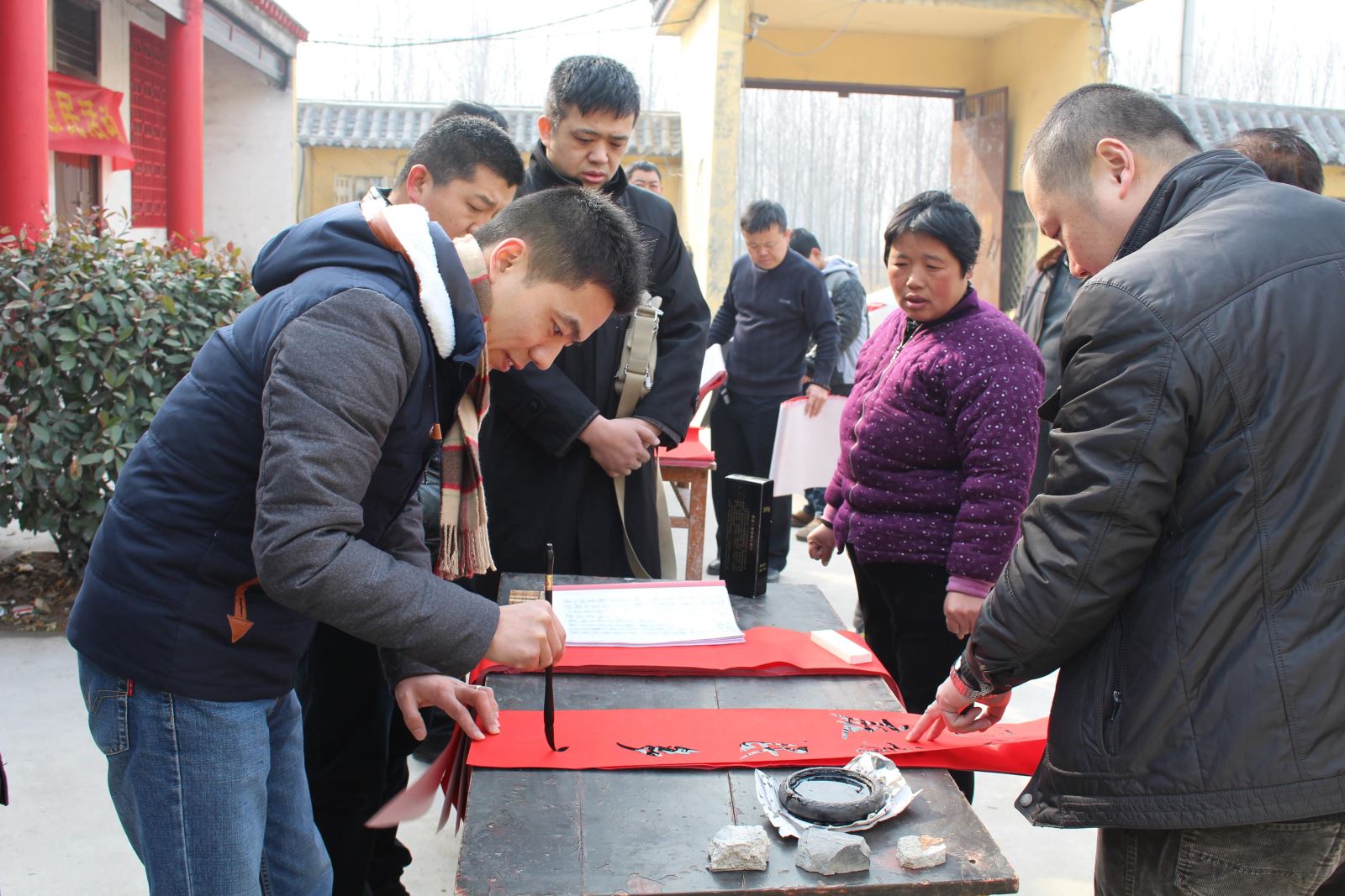 一位村民对我们说:"过年了贴上红红的春联既吉祥又喜庆,今天你们来得可真是时候,我们不用出去花钱买春联了,而且还是大书法家亲笔写的春联呢。"